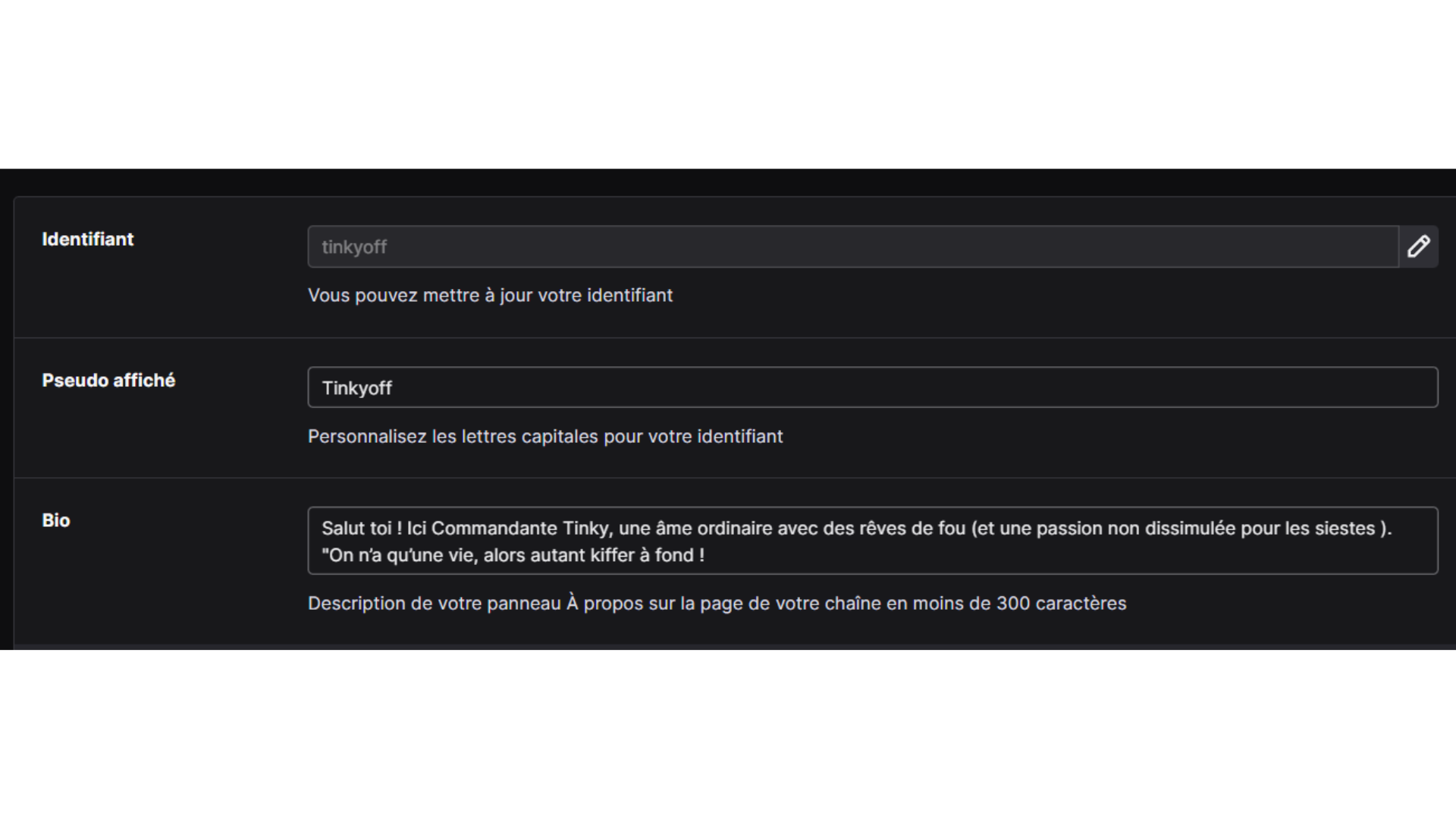 Identifiant : Tu peux le changer tous les 60 jours, mais essaye de le garder constant pour que les viewers te reconnaissent facilement.
