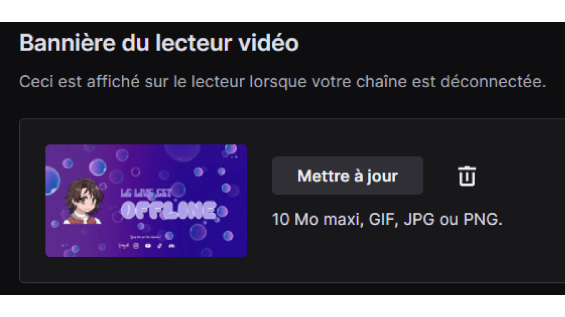 Bannière du lecteur vidéo : Inclue tes réseaux sociaux, ton planning ou une image représentative.